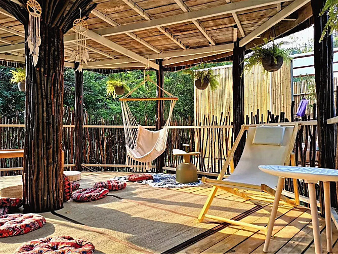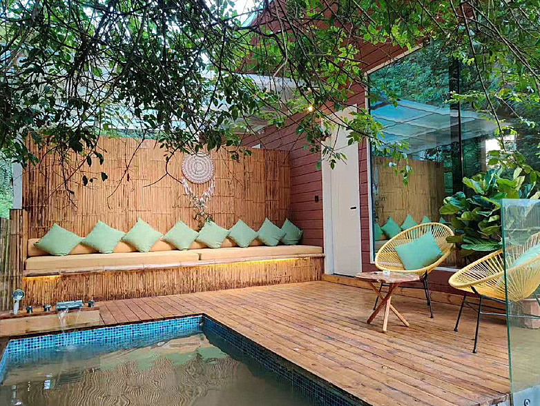 花深里·野奢酒店将原野的一草一木,菊花,方竹,青石,溪流,萤火虫,树蛙以及本地文化都融入设计元素内。原始材料撞上非传统方式,打造了一个精致而美好的世界。夕阳西下,在躺椅上赏落日余晖,闲憩片刻,在夜里兴许可以看见溪水草丛间的点点萤火。