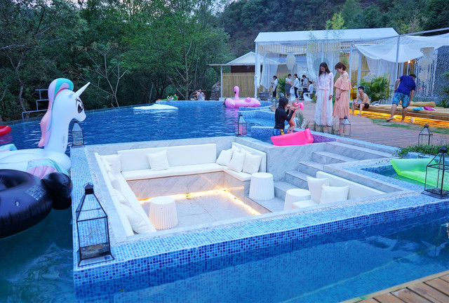 白日里的艳阳将泳池的水暖热,踏入池水,被温柔的水包裹住肌肤,像鱼儿般畅游。游累了,可以在泳池中间的方形下沉式观景台休息,配上清凉的甜品,真是惬意。