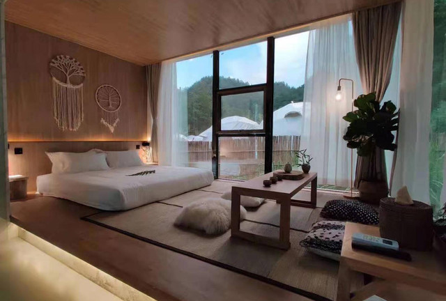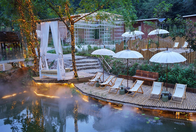 花深里·野奢酒店,将原野的一草一木,菊花,方竹,青石,溪流,萤火虫,树蛙以及本地文化都融入设计元素内。建造时就地取材,用竹子进行艺术创作和房屋隔断,原始材料撞上非传统方式,打造了一个精致而美好的世界。