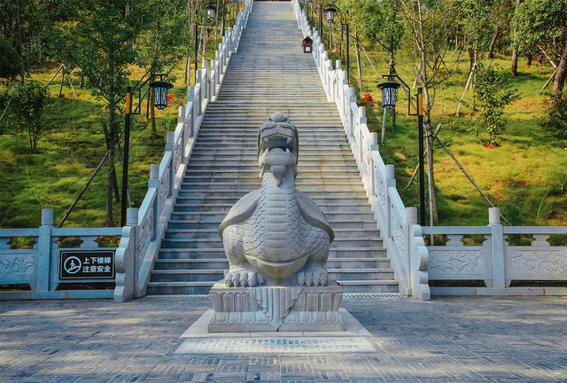 从入口至中心广场由三级平台组成,同时中心广场平面呈宋朝官帽型,寓意着沿“红毯”青云至上,步步高升之意。广场主雕由人物故事群雕和金榜提名雕塑结合组成,其中正面群雕又由“喜迎队伍”、“中榜**”、“书塾”三部分组成。